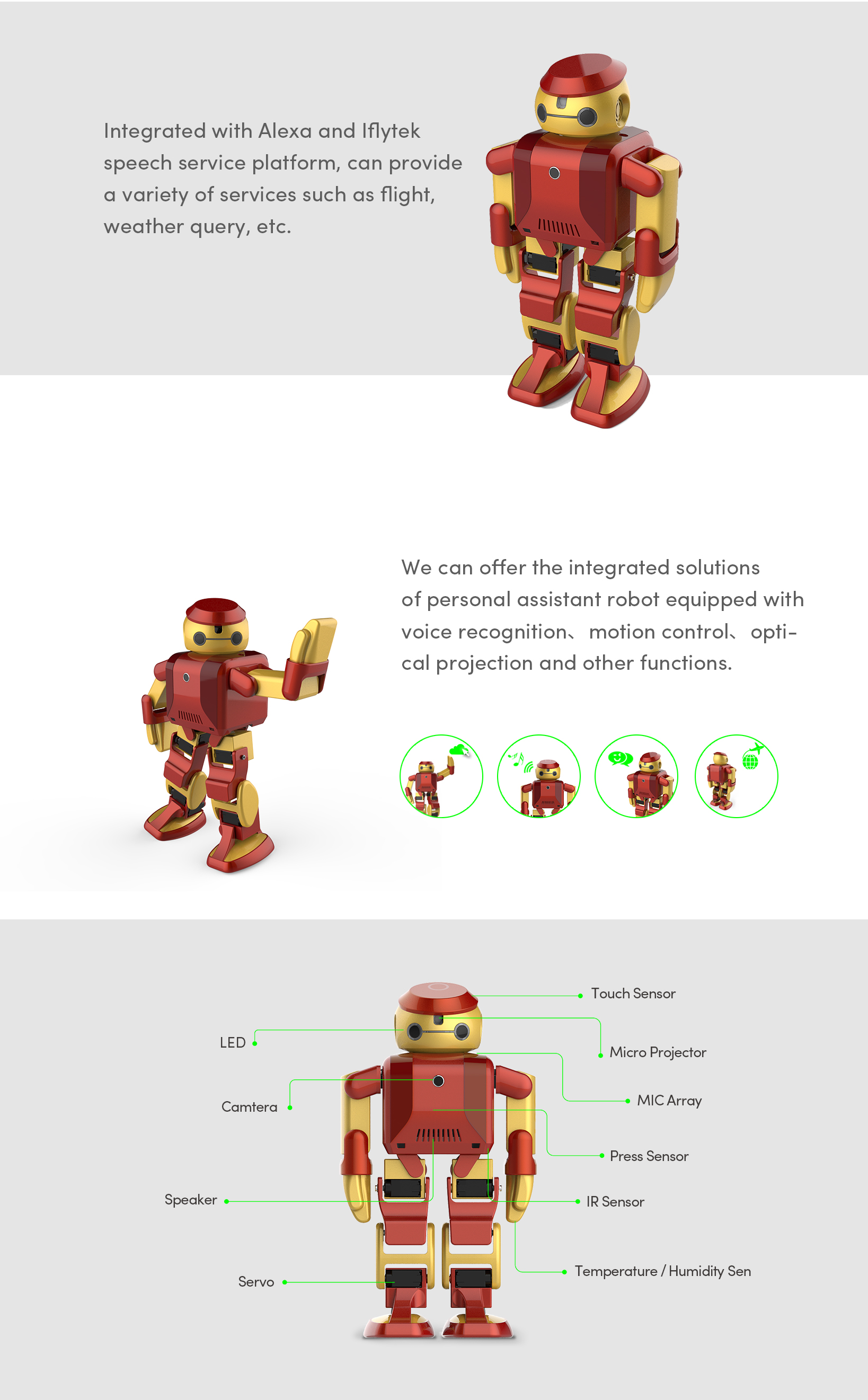 Integrated with Alexa and Iflytek speech service platform, can provide a variety of services such as flight, weather query, etc. We can offer the integrated solutions of personal assistant robot equipped with voice recognition、motion control、optical projection and other functions.